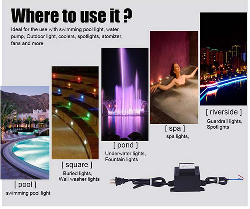 Ideal for the use with swimming pool light, water pump, Outdoor light, coolers, spotlights, atomizer, fans and more.