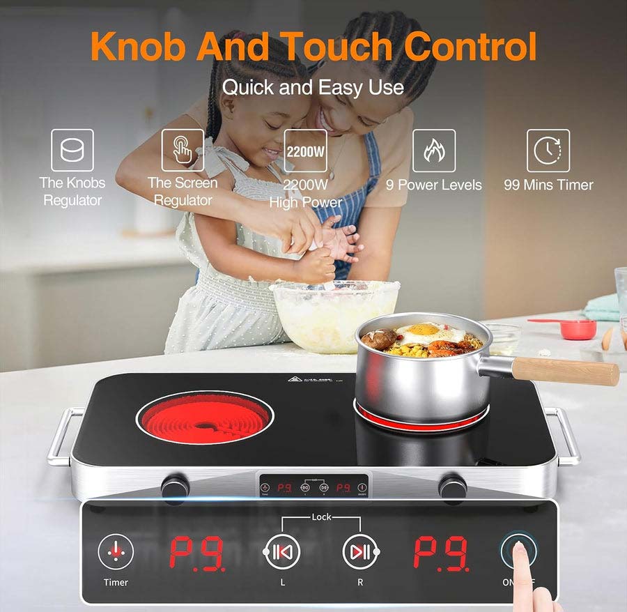 * Sensor Touch & Knob Control:The Electric stove top panel can be touched slightly to choose cooking mode, turn on child lock or set timer. cooktop knob is used to adjust 9 power levels and 99 mins timer. As you set up a 99mins timer to turn off automatically when the cooking completes.